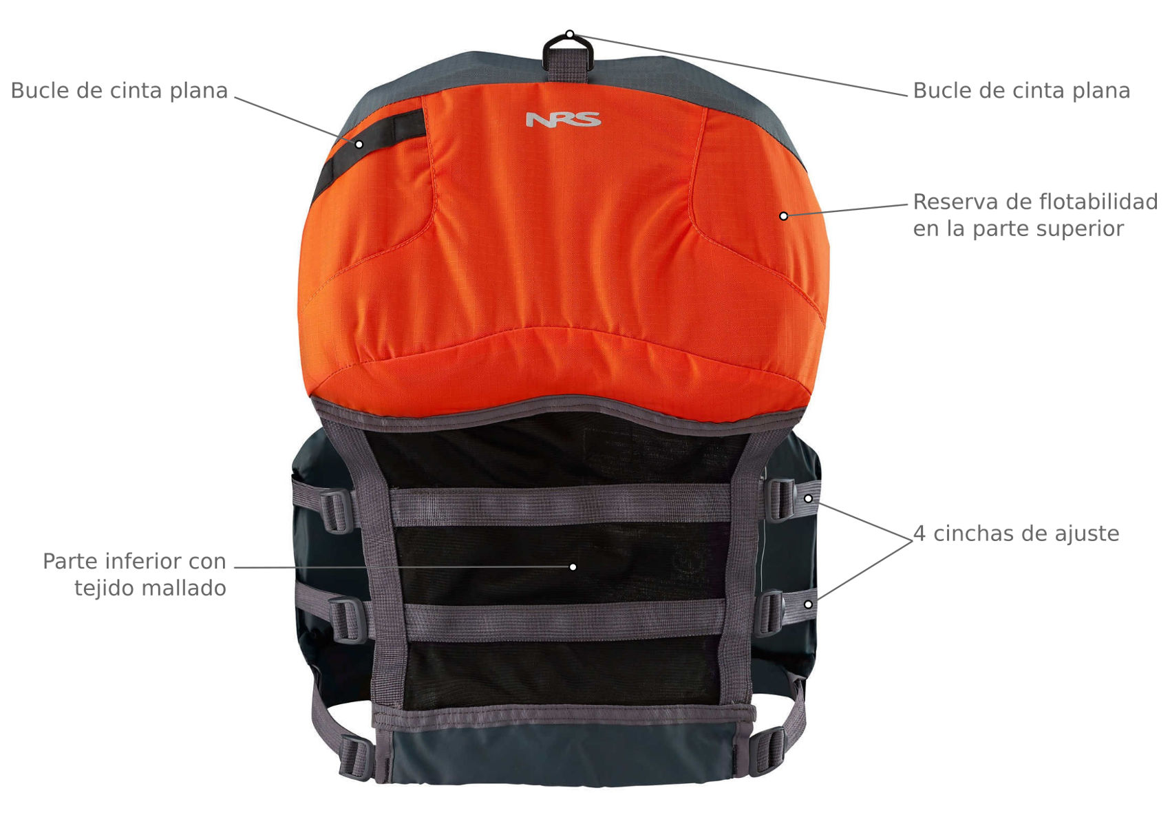 La reserva de flotabilidad de la parte trasera está elevada para que no moleste al sentarnos en la mayoría de los asientos de las principales marcas. La parte inferior trasera es de malla lo que facilita la transpiración de la parte baja de la espalda, algo que se agradece sobre todo en los días cálidos.