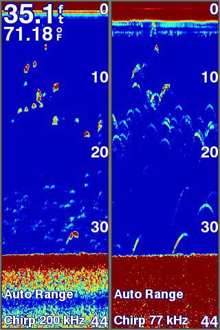 En lugar de emitir una sola frecuencia, CHIRP emite barridos de frecuencias continuos con una intensidad que abarca desde niveles bajos a altos y, a continuación, las interpreta una a una a medida que las recibe. Gracias a que las frecuencias proporcionan un espectro de información más amplio, la tecnología de sonda CHIRP es capaz de crear arcos de peces de forma nítida con una separación de objetivos superior.